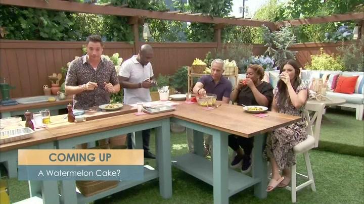 The Kitchen is savoring the season with recipes showcasing summer produce. Katie Lee makes her Grilled Teriyaki Steak and Plums, and Sunny Anderson assembles a fresh and flavorful Heirloom Tomato and Pesto Tart. Chef Cliff Crooks drops by to make Shrimp and Summer Squash Salad, and the hosts whip up a wow-worthy Watermelon Bombe dessert. Finally, Chef Michael Symon fires up the grill with his Smoky Grilled Pork Chops and Zucchini Noodles before the hosts share their best tips for using up summer herbs.