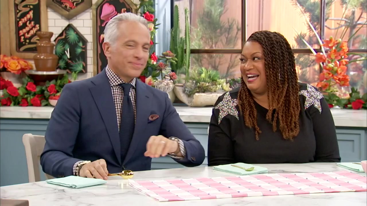 The Kitchen is sharing delicious recipes for a saucy Valentine's Day meal. Jeff Mauro sears up steaks to pair with Sunny Anderson's Easy Red Wine Peppercorn Sauce and Geoffrey Zakarian's Bearnaise Sauce. Geoffrey makes his Roasted Potatoes with Warm Blue Cheese Sauce as the perfect side dish, and Jeff shares a saucy dessert with his Butterscotch Sauce Sundae. Sunny, Jeff and Geoffrey work together on Katie Lee's Spicy Lobster Pasta and then make a romantic Melting Heart Cake. Geoffrey also shakes up a Chocolate Blood Orange Martini, and the hosts play a match game with cheese and chocolate pairings.
