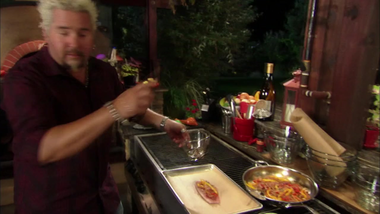 Description: Guy Fieri is baking catfish filets with peppers and onions inside individual parchment packets. Next up, a crunchy kale salad with walnuts and pecorino