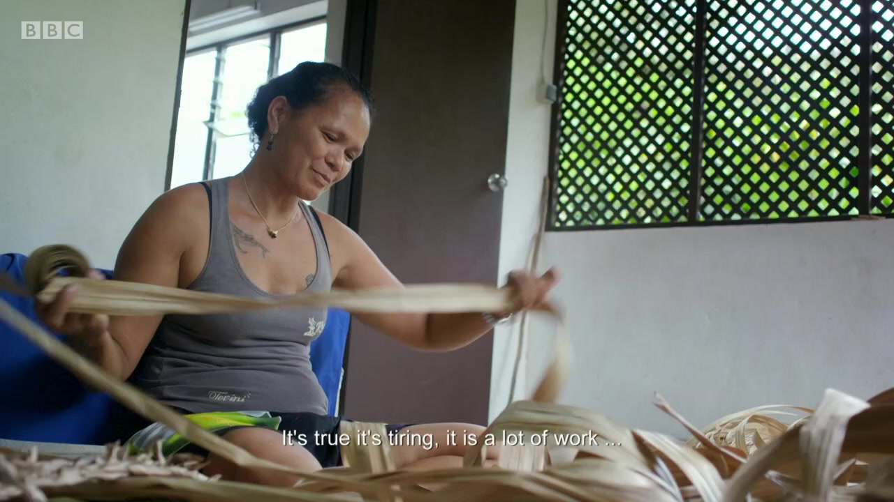 Taking five weeks to make, these hats were originally introduced to the island by British missionaries in the early 1800s. Now, they're worn to church and given as wedding gifts. But the knowledge of how to make them is dying out. For each hat, 30 or more long pandanus leaves have to be cut down, spliced together, hung, dried, rolled, sorted, dyed and bleached. And that's all before the weaving actually begins. Without a template or stitches or any thread, Mama almost magically weaves the dried leaves into a hat.
