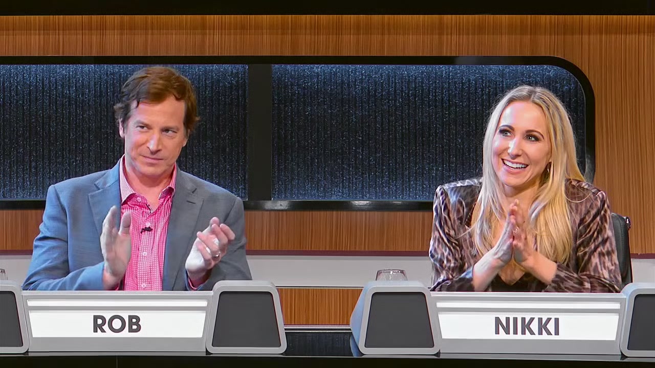 Celebrity panelists Joel McHale, Amanda Seales, Ron Funches, Ana Gasteyer, Rob Huebel and Nikki Glaser.