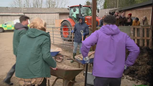The celebs arrive on the farm in style before adopting calves, mucking out a calf creche and discovering a caravan park from hell. Farmer Chris gets very angry.