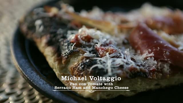 Guy Fieri is getting big tastes in small plates. Traci Des Jardins starts off with her Mashed Pea and Ricotta Toast before serving some samplers of Spicy Tuna Tostadas. Michael Voltaggio is a class act with his Caviar and Buckwheat Crepes, his "Charcoal" Potatoes with Sour Cream, and Pan con Tomate with Serrano Ham and Manchego Cheese. Antonia Lofaso gets us going with her Red Hot and Bothered drink before smoothing us out with her Smoked Trout Dip and Pickled Veggies. Marc Murphy makes Mini Eggplants Parmesan and Cucumber and Watermelon Radish Salad.