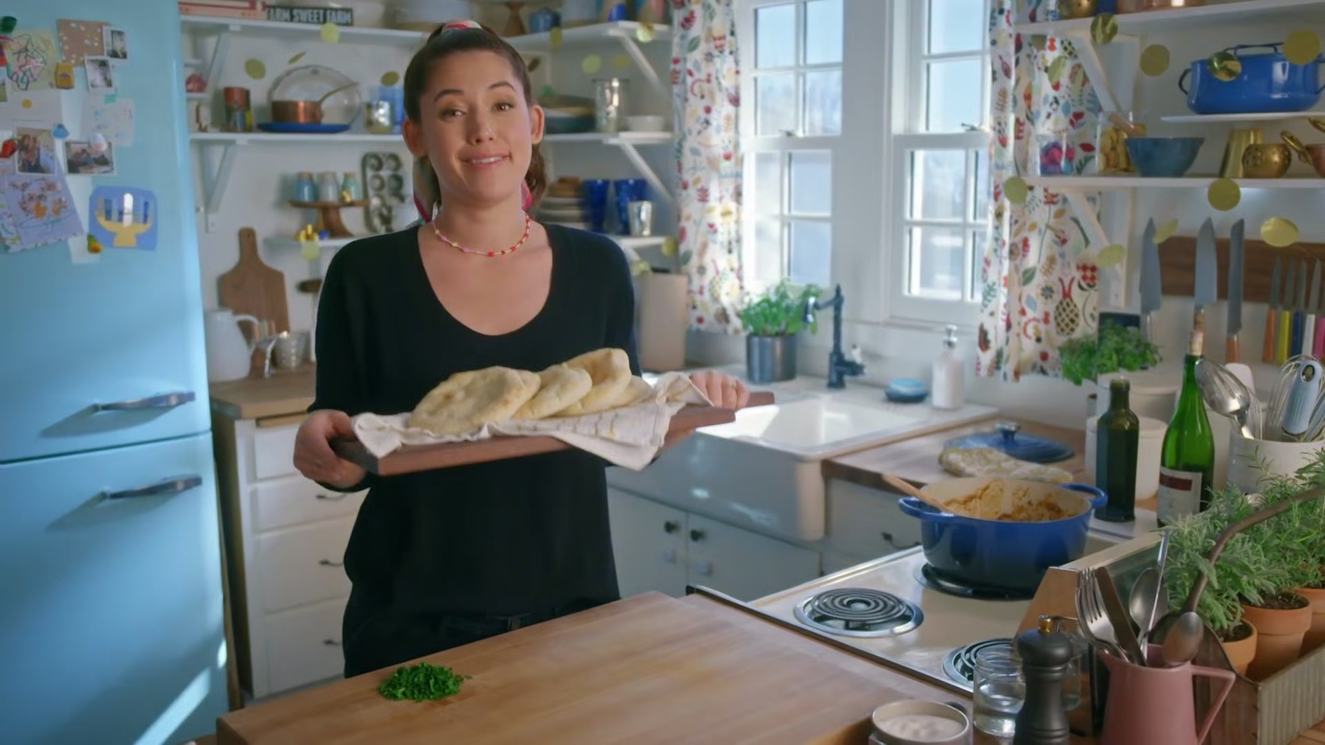 Molly Yeh is going all out for Hanukkah with an ugly sweater party and heaps of marvelous food, including rich and hearty Beef Stew with Fluffy Pitas. She also makes Mini Sufganiyot Salad drizzled with creamy tahini dressing, and her Chocolate Coconut Shake with a Latke Stack satisfies both sweet and salty cravings for dessert. Finally, Molly ups the ante on the high-stakes dreidel game with Hazelnut Gelt Cookies.