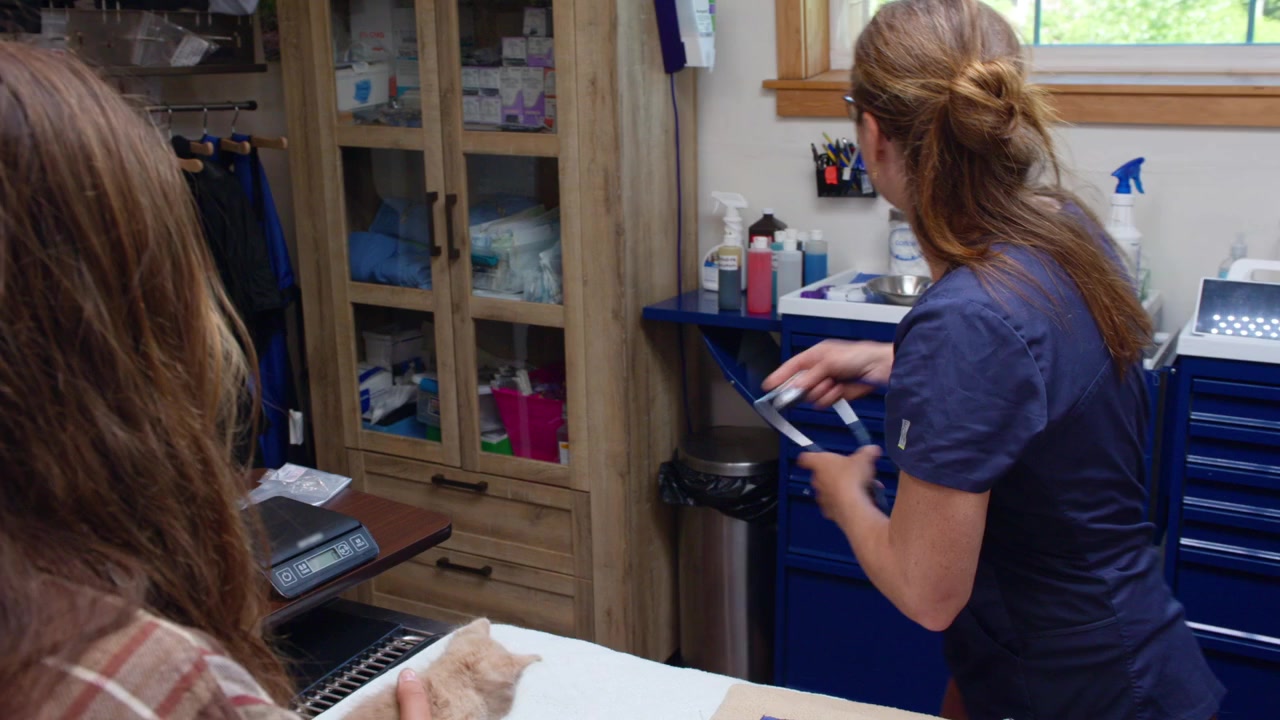 Dr. Oakley treats a kitten with a bulging eye, and Sierra preg checks a miniature cow.