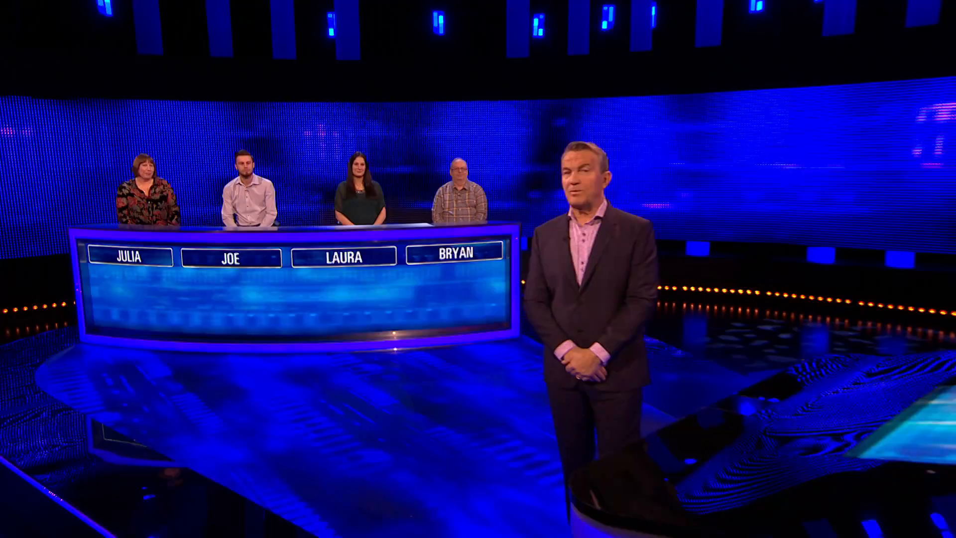 Description: Bryan from Bangor, Laura from Basingstoke, Joe from Stratford upon Avon and Julia from Milton Keynes work together as a team to take on one of the country's finest quiz brains