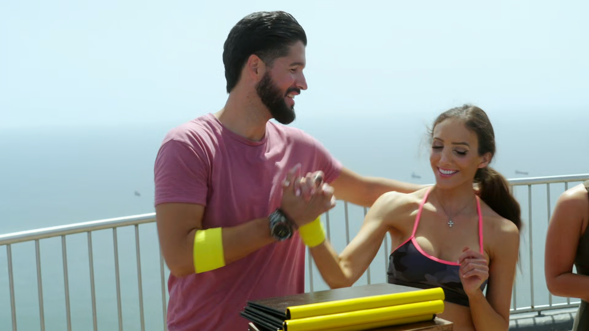 The boat pulls into the impressive port of Gibraltar, where the new couples compete in their first challenge -- running up a mountain while truthfully answering personal questions about their romantic history.