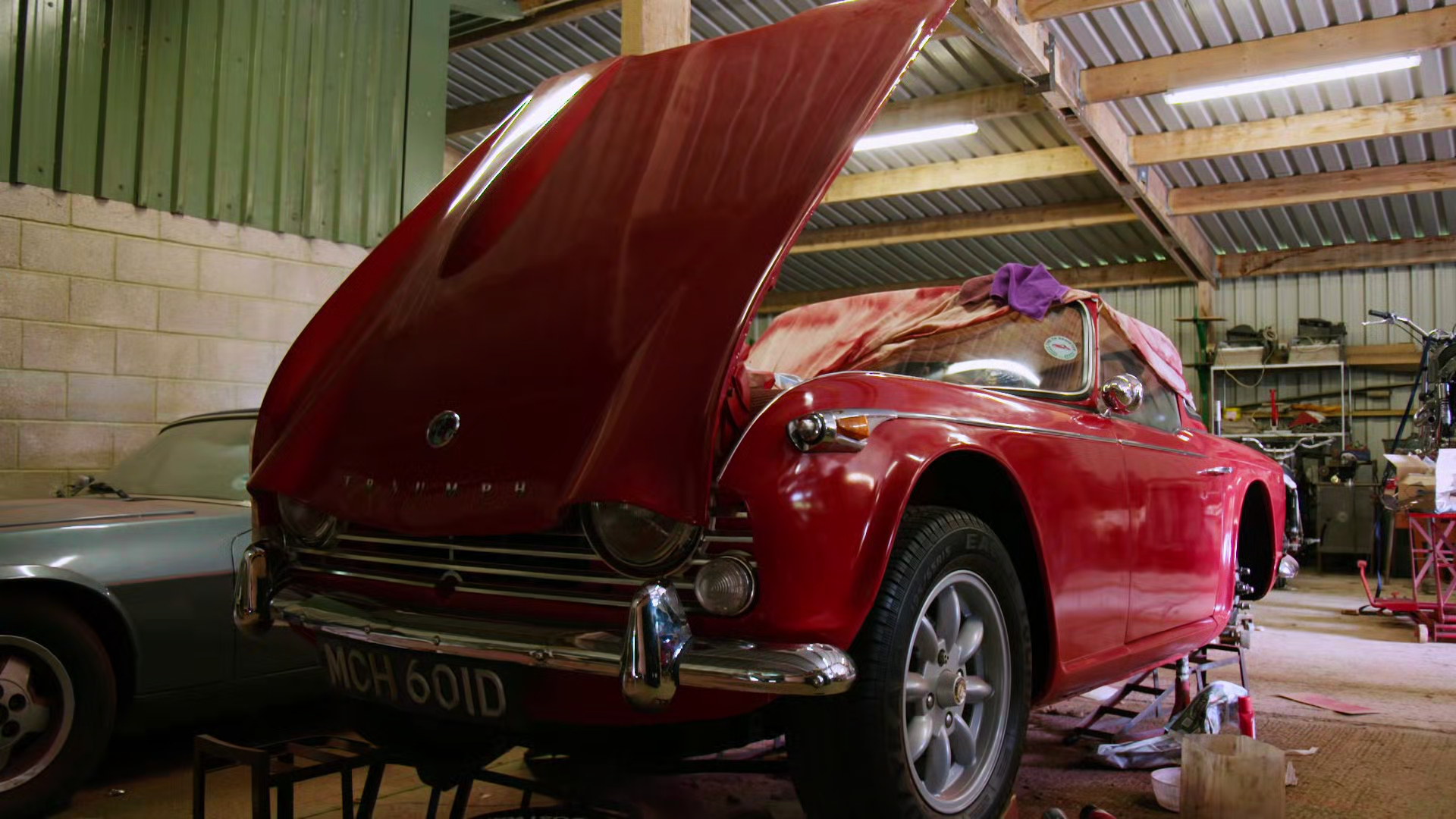 Henry and Fuzz examine a rare Triump TR4 and a Jaguar XJS.