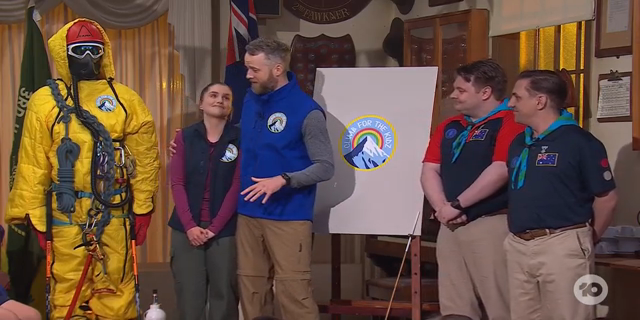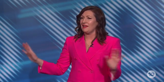 Anne Edmonds, Sam Pang, Frankie McNair & Hamish Blake step through the blue door for the first episode of Thank God You're Here.