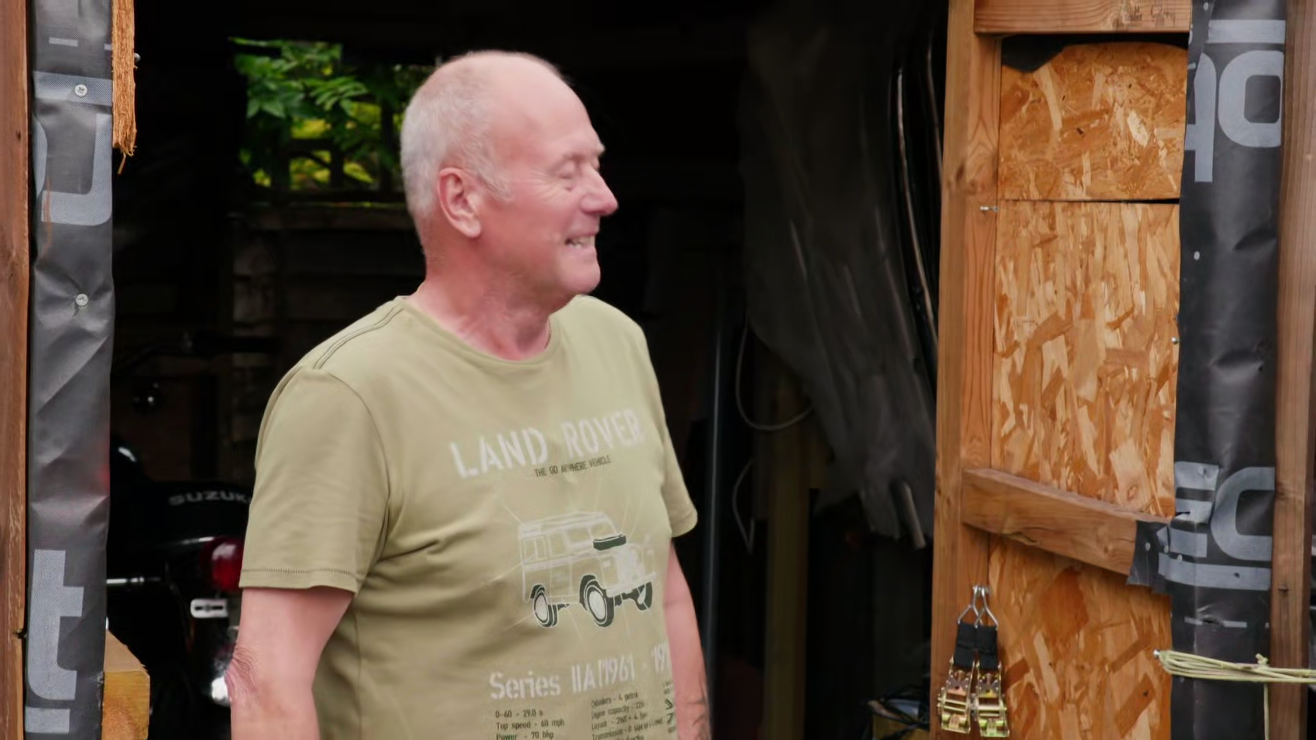 Henry and Fuzz eye up Neil's collection of Japanese bikes, cars and campers.