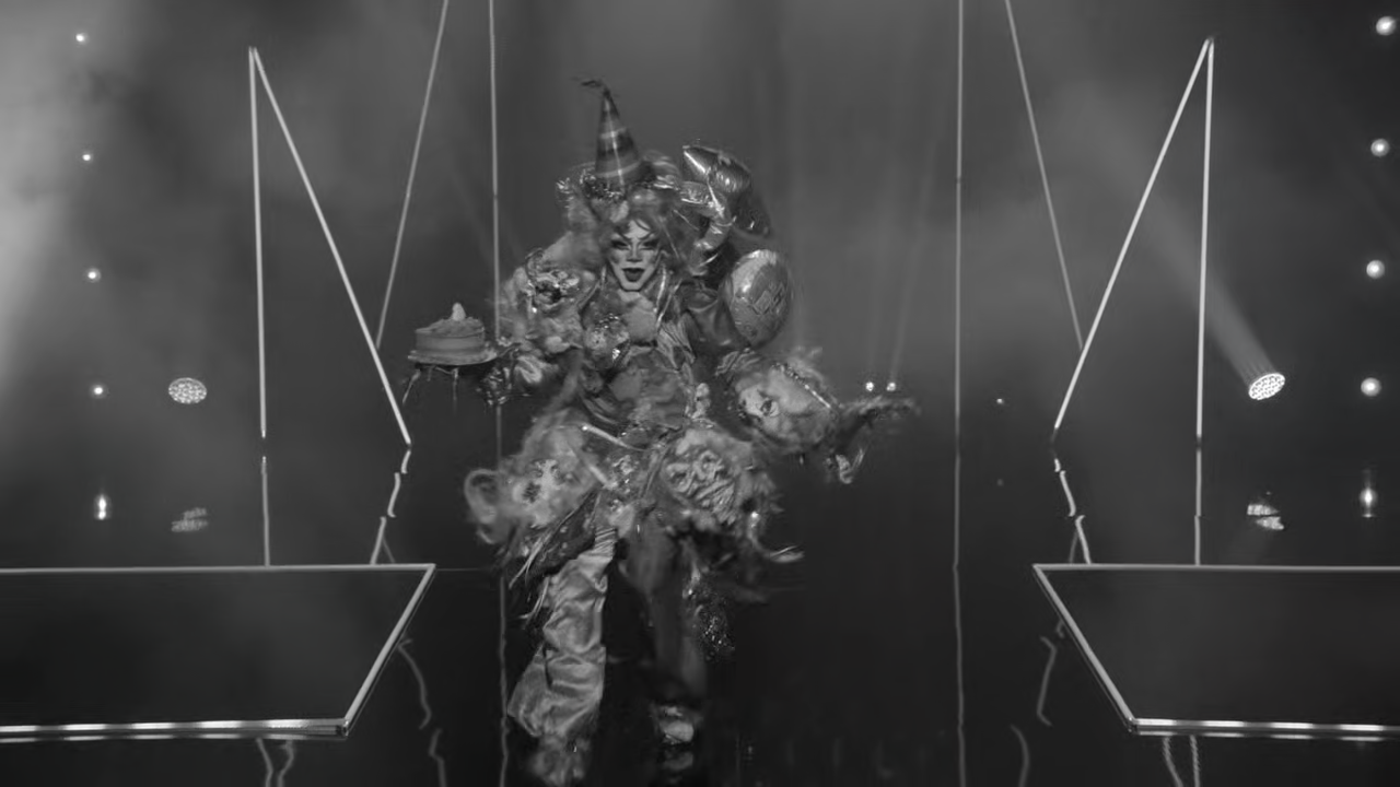 Drag stars craft holiday horror looks.