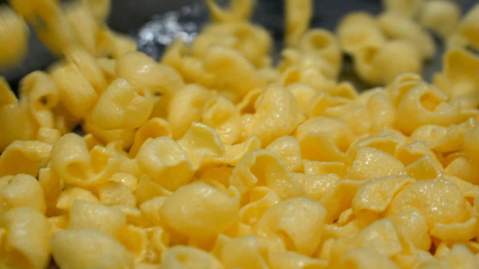 To ensure every one of the snacks ends up with the famous curly shape, the dough is stretched over rollers to add tension. Then it travels through an 18-metre-long steamer, increasing the moisture level in the dough to 40%, making it more pliable and stretchy. After being quickly cooled, the continuous sheet of dough is sent rushing through a machine which chops it into 13 millimetre by 40 millimetre pellets, at a rate of 7,900 a minute. But the pellets contain too much moisture, so they are sent through a series of dryers, bringing the moisture content down to 11%.