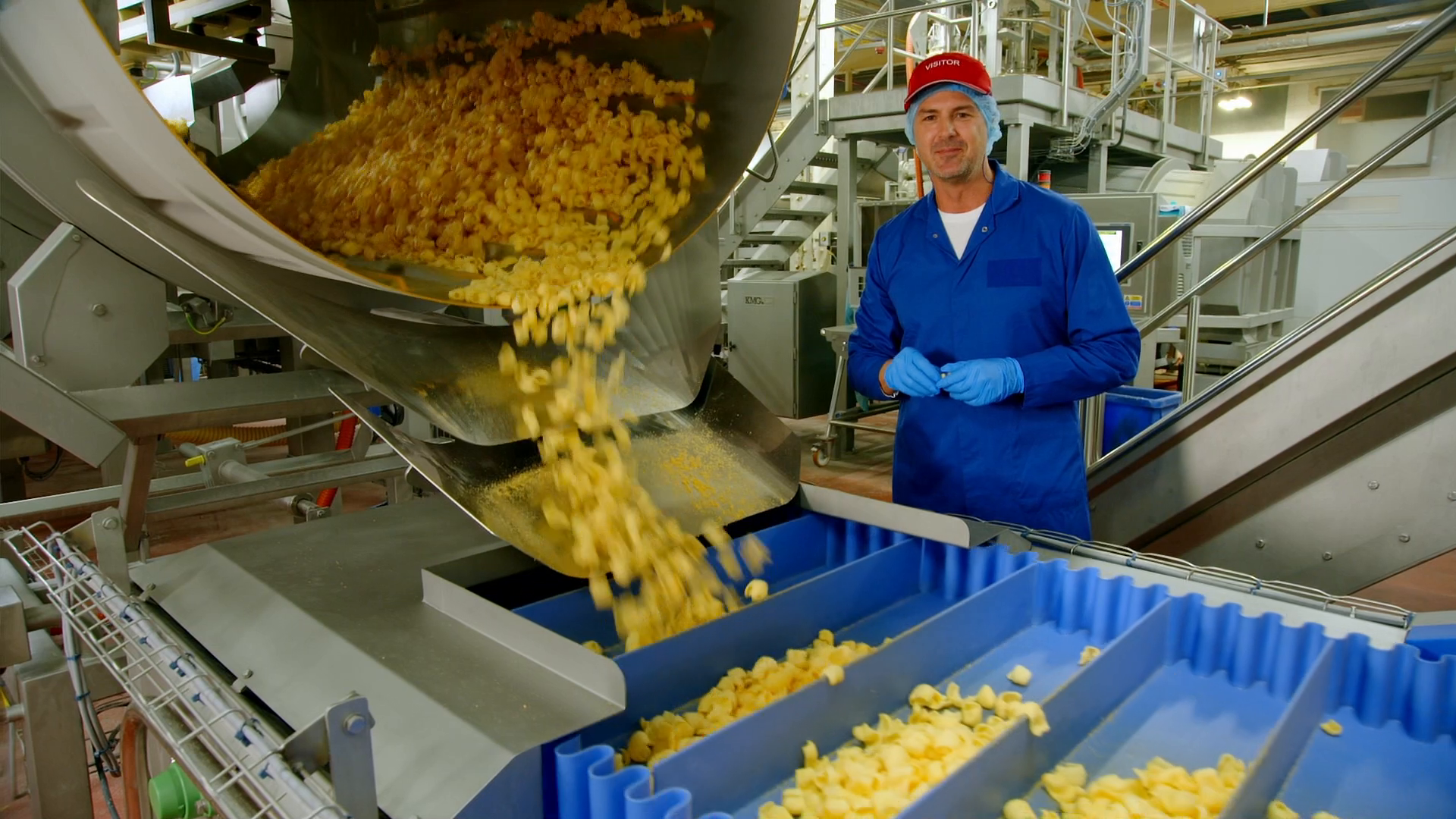 Over in the frying area, Paddy learns how 1.2 tonnes of pellets travel through a specialist fryer every hour. Inside the fryer, the pellets are plunged into sunflower oil heated to 200 degrees Celsius. The heat of the oil causes any remaining water inside to turn to steam, puffing them and leaving tiny air holes. At the same time, the tension created when the dough was stretched now contracts and curls up. After twenty seconds in the oil, 1.8 million perfectly-formed curls cascade out of the fryer every hour. Finally, Paddy is able to see the curly snack he knows. There is one vital thing missing from the snacks though – cheese flavouring. To put that right, each one of the freshly cooked curls travels through a huge metal drum where a precise amount of cheese powder flavouring is applied.