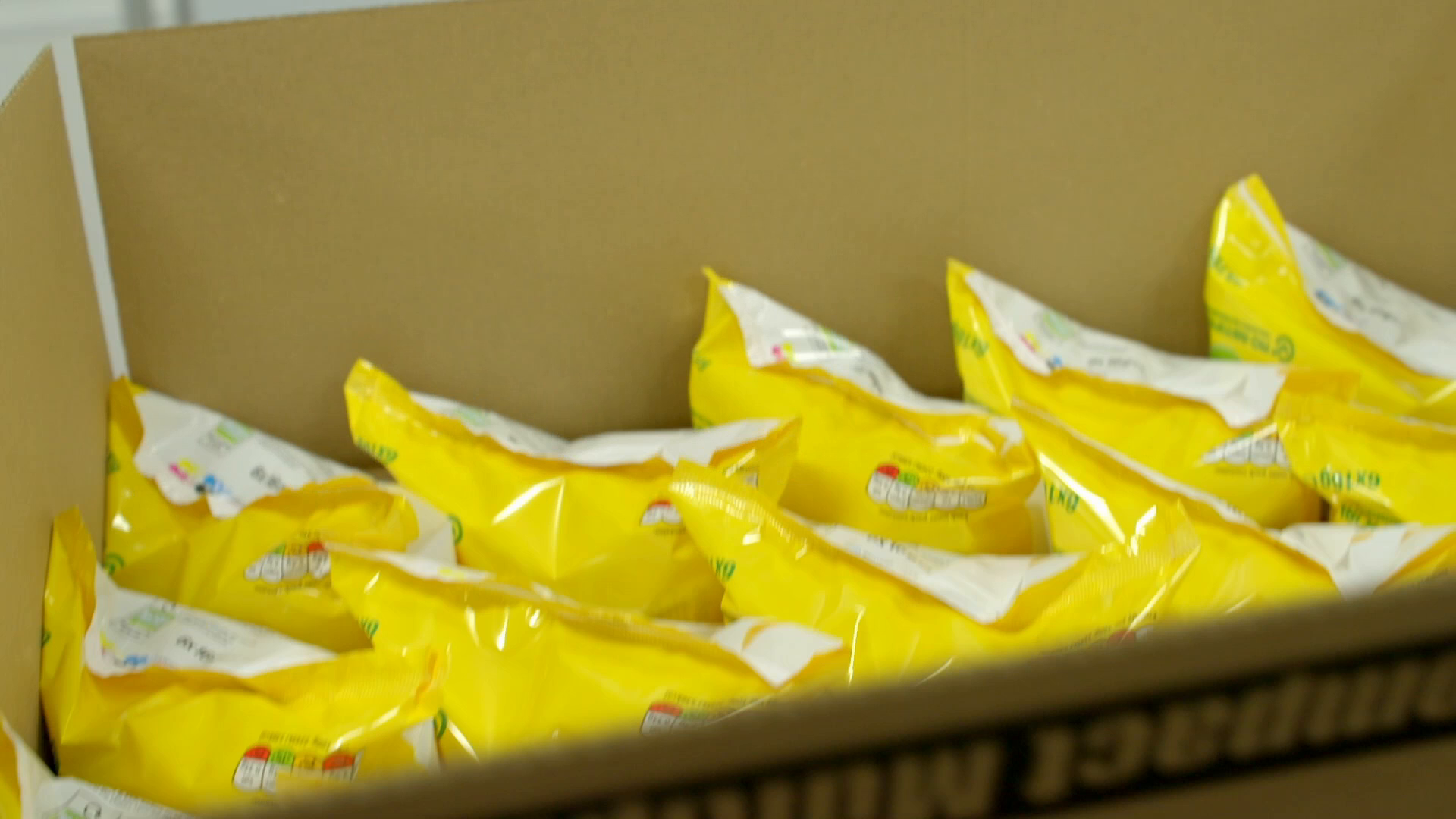 After a welcome taste test, Paddy follows his snacks, still warm off the production line, to the packing department. First, a specialist machine called a multi-head weigher carefully portions out 16 grams of cheese curls before another machine seals them neatly into aluminium and plastic packets. Then, each packet is sent hurtling towards a robot which sorts them into groups of six, before they are packed into multipack bags.