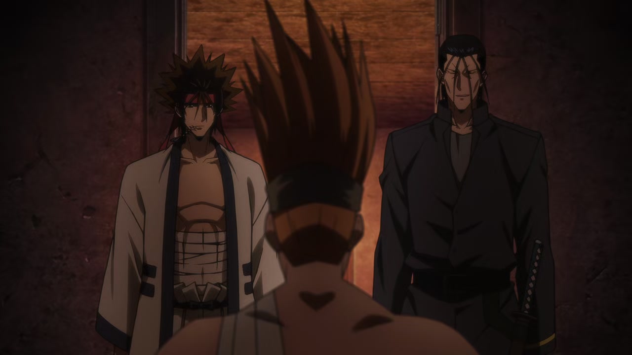 Aoshi injures Okina, leaves Misao behind, and shows up at Aoiya. He asks the Oniwaban Group where Kenshin is. Aoshi's in a ghastly state, but accepts what Yahiko and Kaoru tell him and decides to wait for Kenshin where Shishio is. Okina is on the verge of death but undergoes treatment by Megumi, who has come rushing to Kyoto.