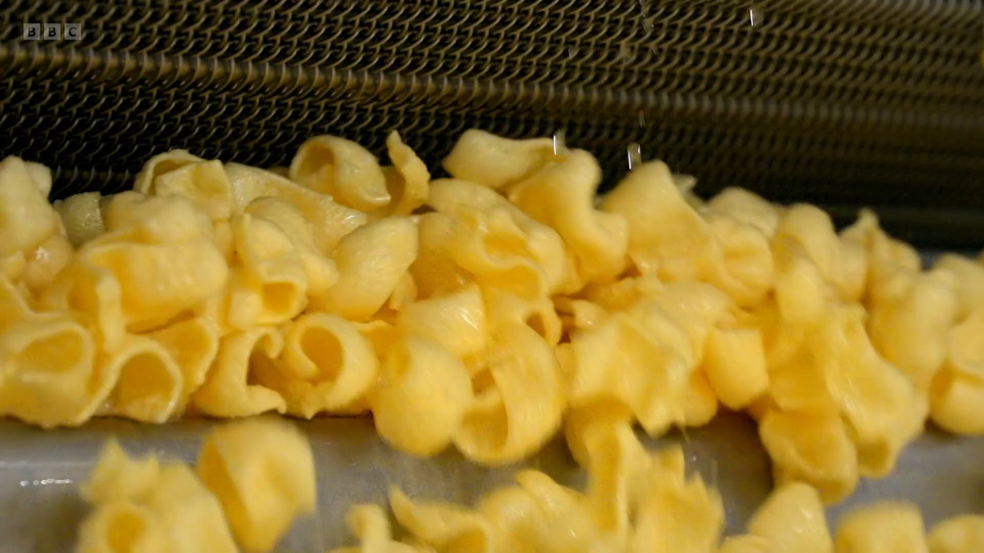 To ensure every one of the snacks ends up with the famous curly shape, the dough is stretched over rollers to add tension. Then it travels through an 18-metre-long steamer, increasing the moisture level in the dough to 40%, making it more pliable and stretchy. After being quickly cooled, the continuous sheet of dough is sent rushing through a machine which chops it into 13 millimetre by 40 millimetre pellets, at a rate of 7,900 a minute. But the pellets contain too much moisture, so they are sent through a series of dryers, bringing the moisture content down to 11%.