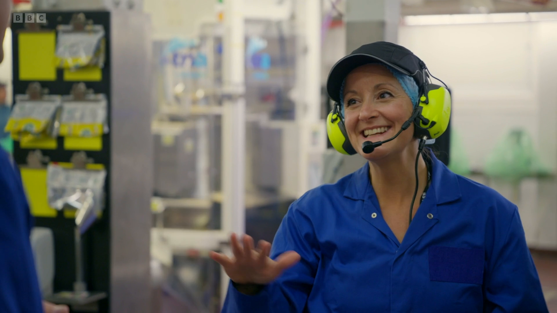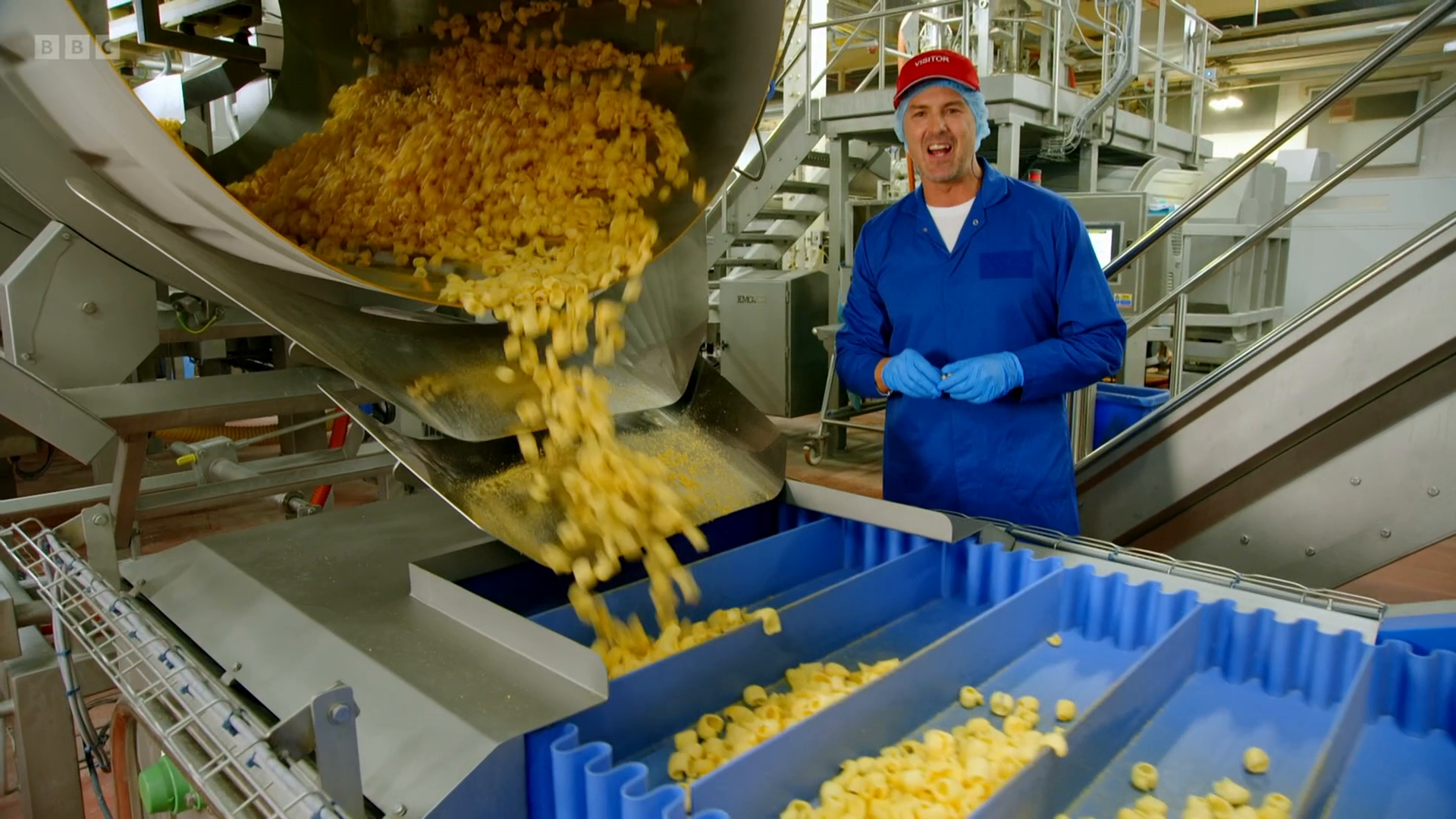 Earlier in the episode, Cherry visits a Walkers crisp factory to learn how the starch from potato crisp production is transformed into the potato starch powder used to make the cheese curls. And she visits another factory in Leicester to find out how ten million bags of Bombay Mix are produced every year.