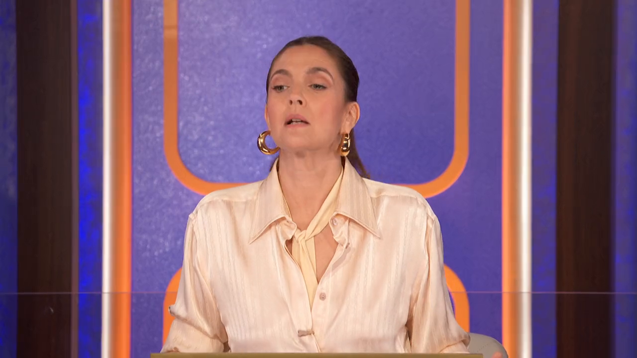 seated at a desk and facing the contestants. The celebrities are asked questions and the