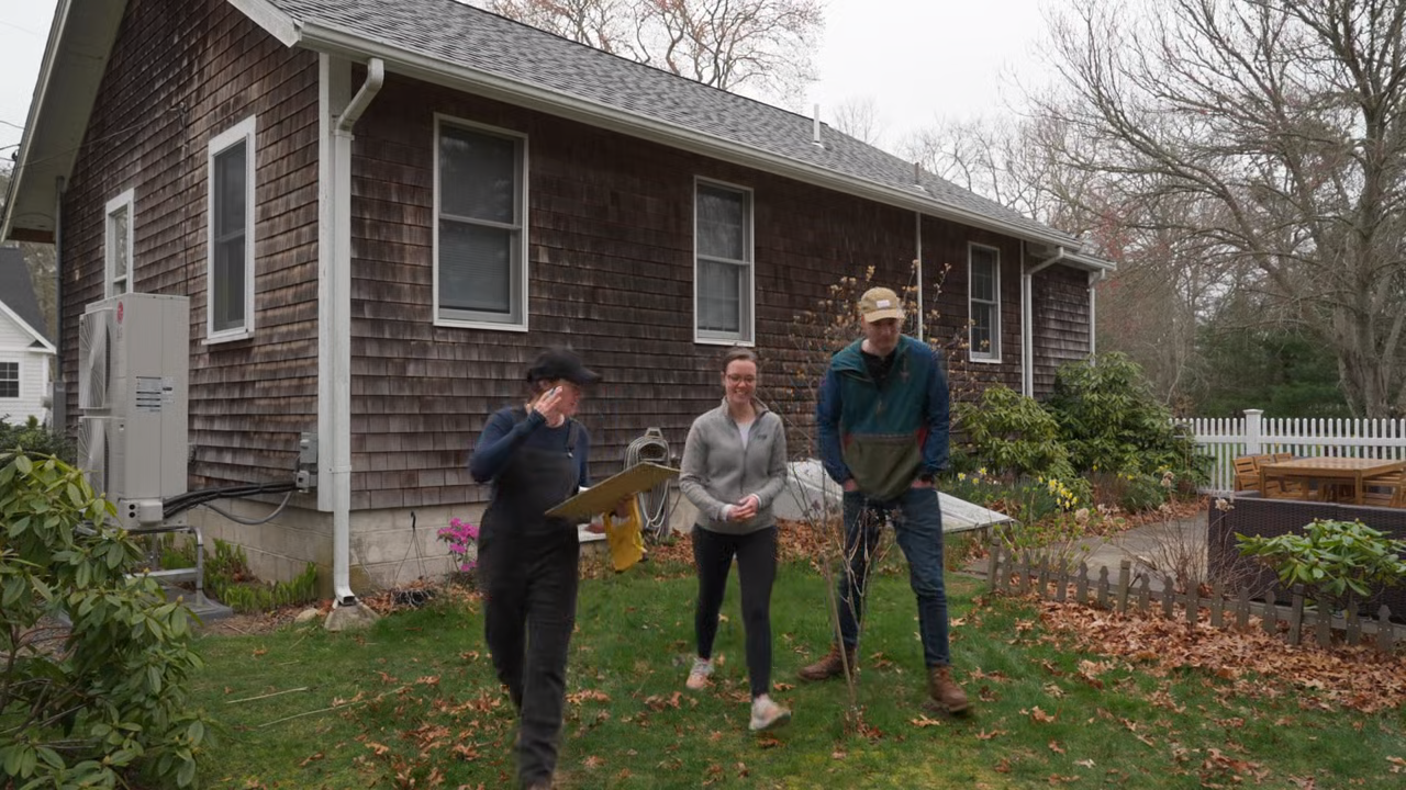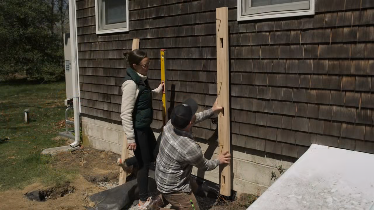 The team builds an outdoor shower for a Cape Cod couple. Jenn and Mark focus on the layout and drainage; Nathan installs the enclosure; Richard makes the water hookup and installs the shower system.