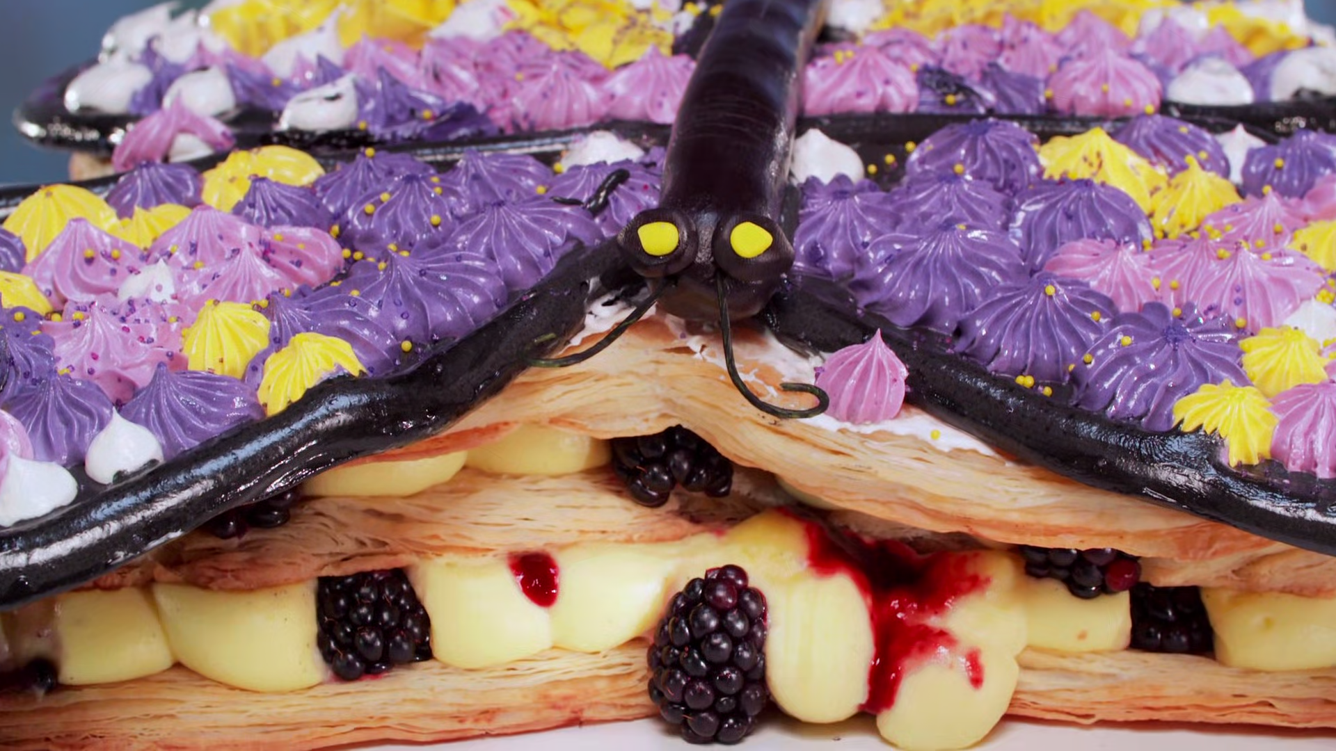 In celebration of the awe-inspiring transformation from caterpillar to butterfly, host Jesse Palmer asks the six remaining bakers to team up to make butterfly-shaped napoleons, each designed to capture the vibrant colors of their assigned butterfly. Then, the teams create cakes that bring the beauty and serenity of a garden to life for judges Duff Goldman, Kardea Brown and Nancy Fuller.