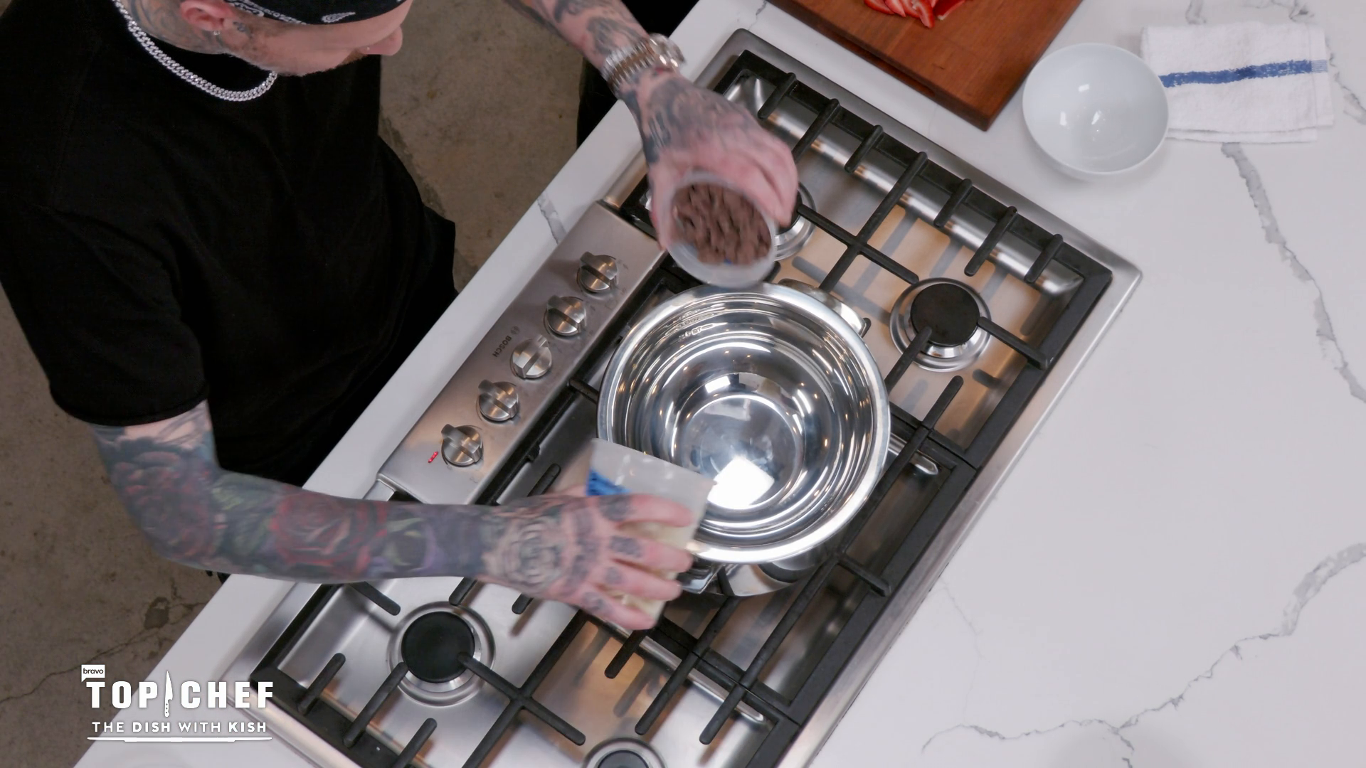 Michael Voltaggio and Kristen Kish create a stunt-inspired dessert with fiery fruit and a frozen dome made to smash!