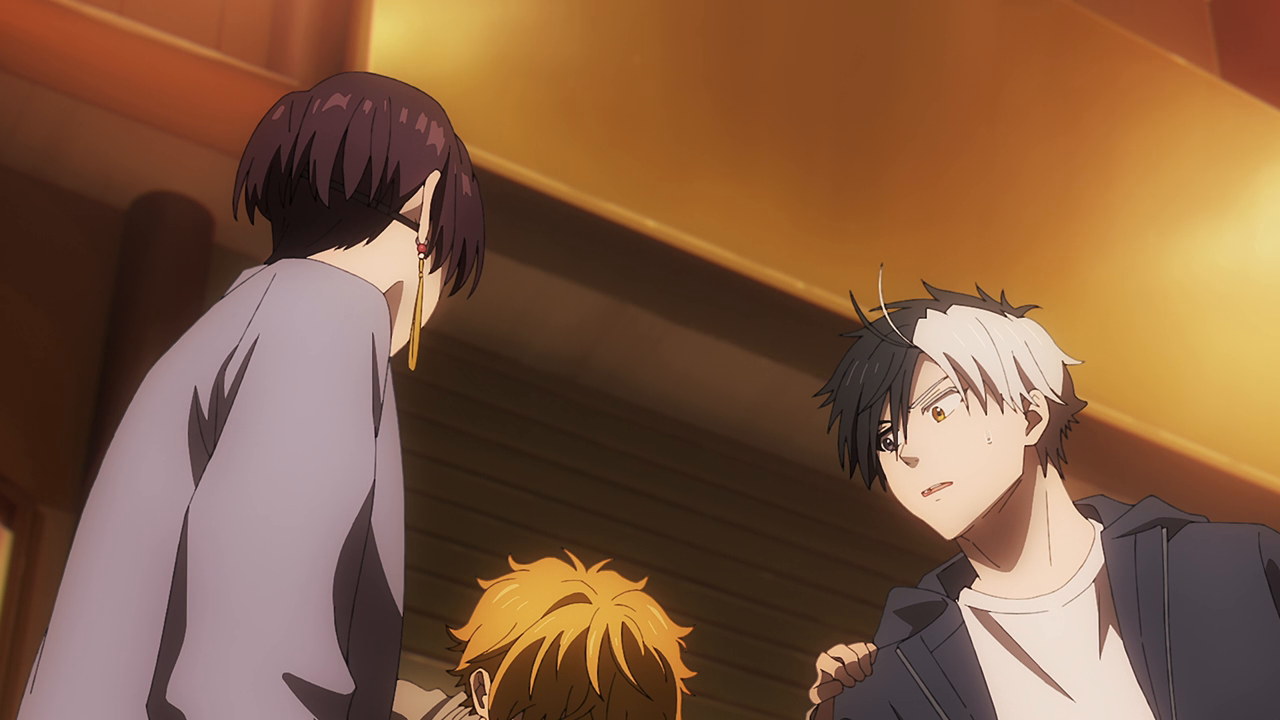 As a thank you for helping Ito recover, Tsubakino takes Sakura, Nirei, and Suo to the neon-lit entertainment district of "Keisei Street," which is full of cozy drinking establishments, mahjong parlors, and bars. The boys are overwhelmed by the atmosphere of this part of town. They head to meet up with Tsubakino when suddenly, a girl in a tattered white dress falls on Sakura. They have no chance to hear the girl's story before a group of thugs approaches them.
