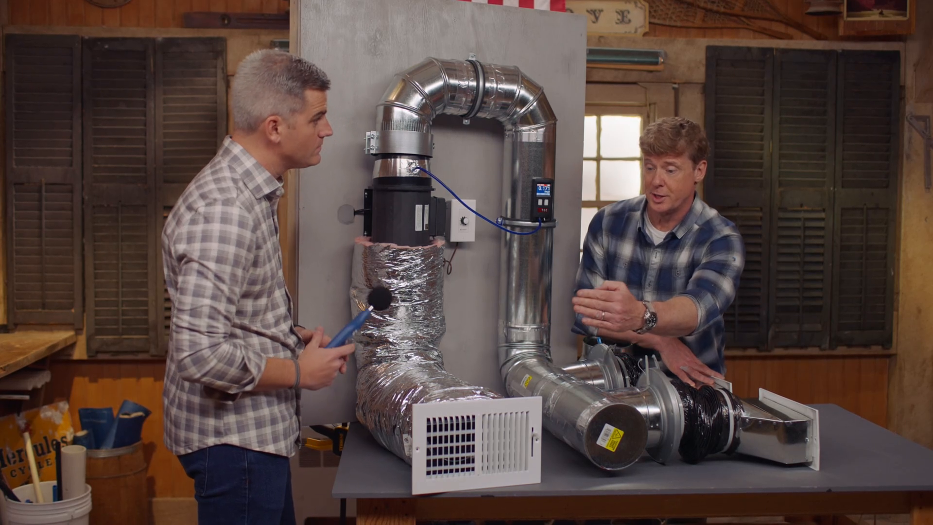 Ross explains common ductwork noises and shares some solutions; Lee demonstrates how to fix a dead lawn by aerating and overseeding; Mark repairs cracked stucco over a concrete foundation.