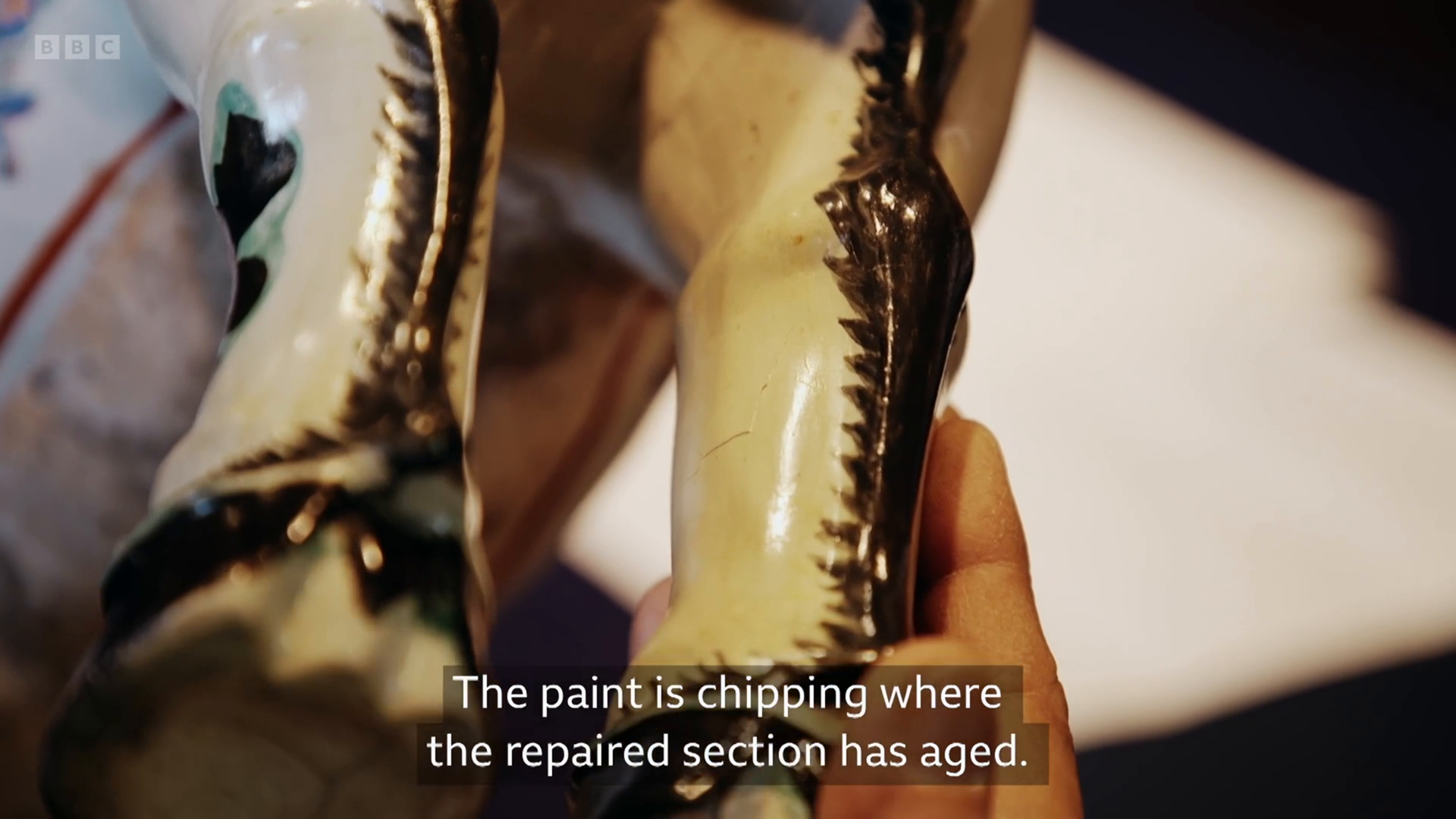 The father and son undertake the restoration of a ceramic horse from the Edo period. A previous restoration is now showing signs of age, and a new approach is needed.