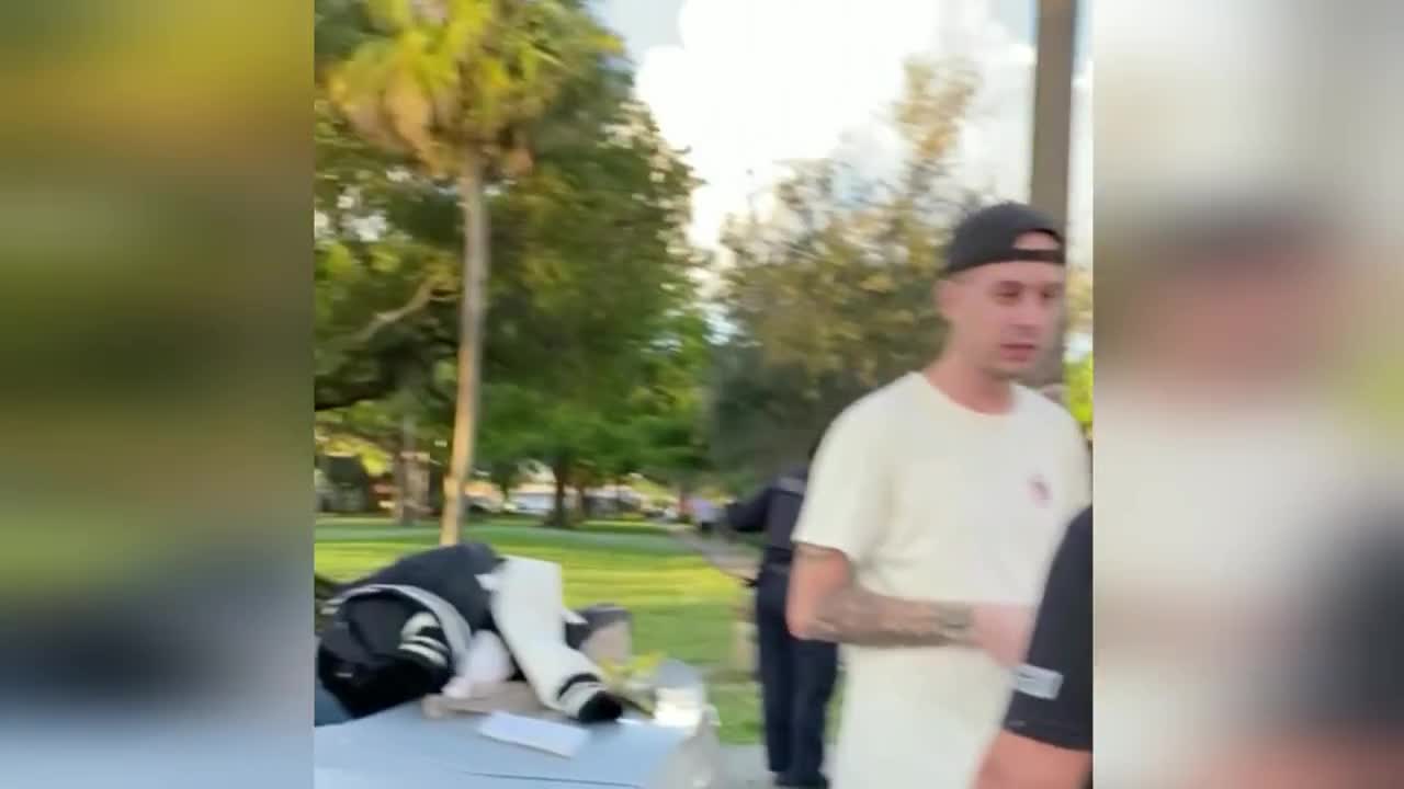 A man in San Diego strikes an SUV with a bat after it appears to hop a curb and head toward him. A cyclist in England has a run-in with a delivery driver. An attempted carjacking in Florida is thwarted when police use a state-of-the-art grappling device. In New York, a woman is sent flying when a garbage truck's mechanical arm grabs the bench she's seated on. A speeding biker in California is pulled over by a no-nonsense officer. A semi truck driver's life hangs in the balance when an erratic driver causes her rig to careen halfway off a bridge in Louisville.