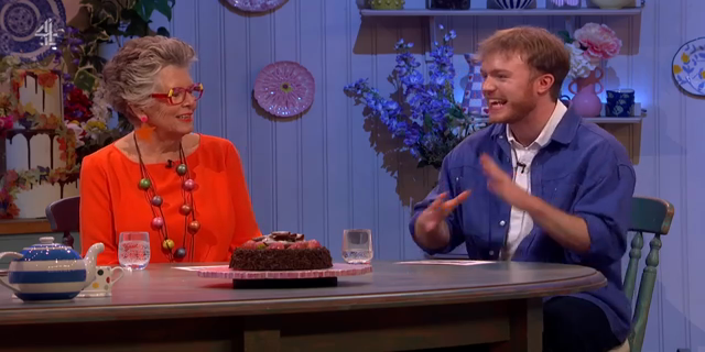 Guests Joel Dommett and Prue Leith help Jo Brand and Tom Allen recall events in Back to School Week. The hosts also catch up with the fourth baker to leave the tent, scrutinise the audience cakes and look at some viewers' home baking pictures.
